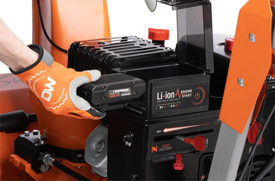 Благодаря установленному Li-ion акумулятору на 21В, двигатель запускается простым нажатием кнопки на рукоятке управления. Обеспечивает легкий запуск холодного двигателя при любых температурах до -30˚C.