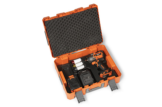 Кейс выполнен из прочного пластика в виде систейнера с замками, обеспечивающими быструю и надежную установку кейсов один над другим, что облегчает транспортировку и способствует экономии пространства для хранения. Отдельный отсек на корпусе кейса позволяет удобно переносить необходимую оснастку.